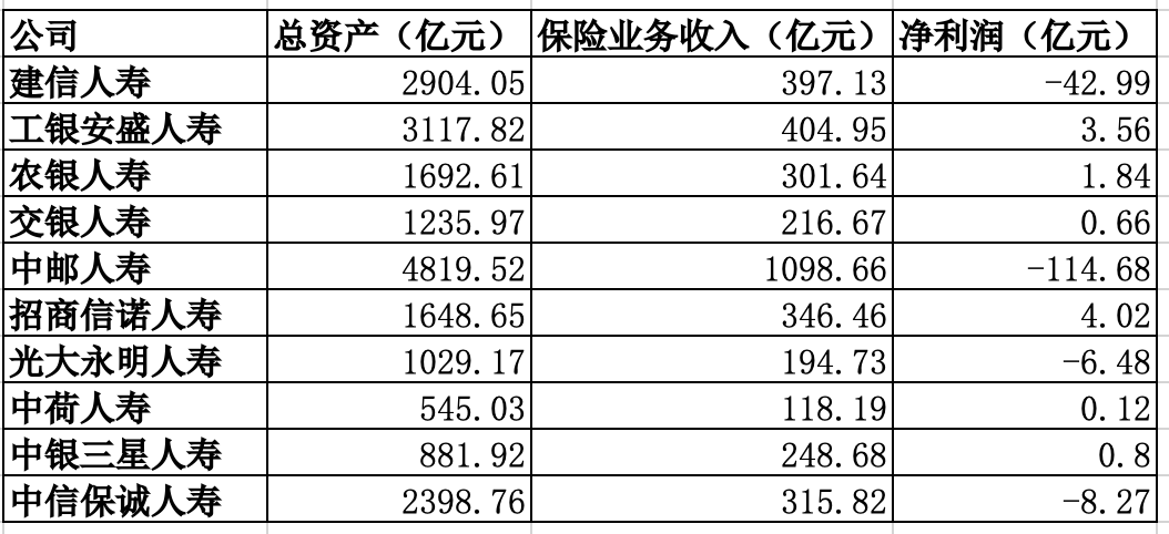 在净利润方面,工银安盛人寿、农银人寿、交银人寿、招商信诺人寿、中荷人寿、中银三星人寿分别实现净利润3.56亿元、1.84亿元、0.66亿元、4.02亿元、0.12亿元、0.8亿元,建信人寿、中邮人寿、光大永明人寿、中信保诚人寿则分别净亏损42.99亿元、114.68亿元、6.48亿元、8.27亿元。