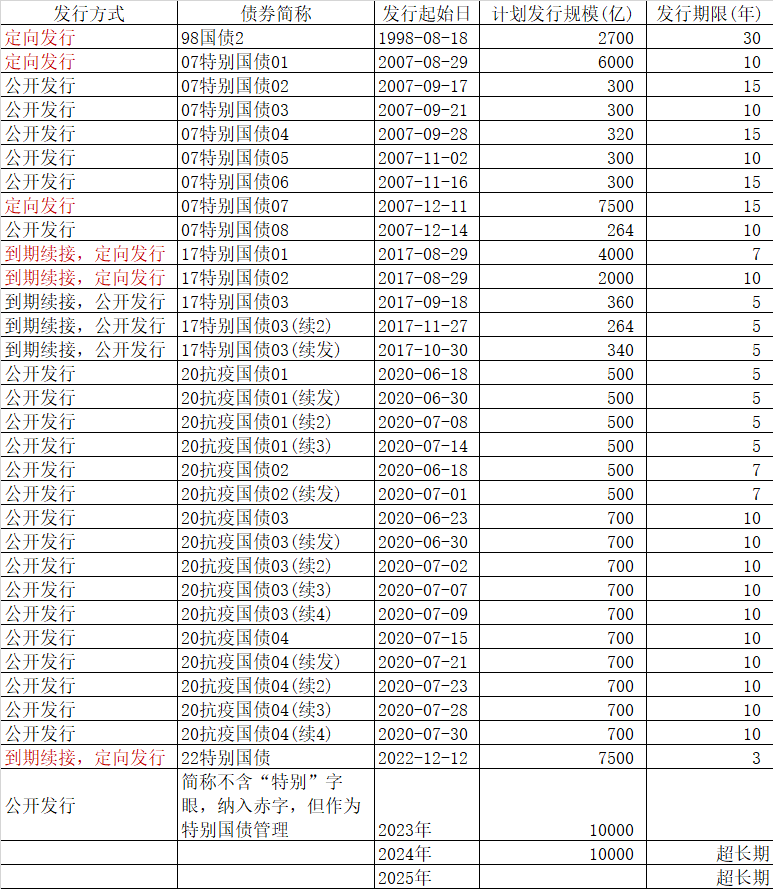 2024年3月5日,政府工作报告指出,为系统解决强国建设、民族复兴进程中一些重大项目建设的资金问题,从今年开始拟连续几年发行超长期特别国债,专项用于国家重大战略实施和重点领域安全能力建设,今年先发行1万亿元。梳理近年来特别国债发行情况如下: