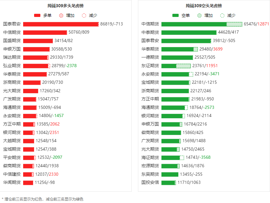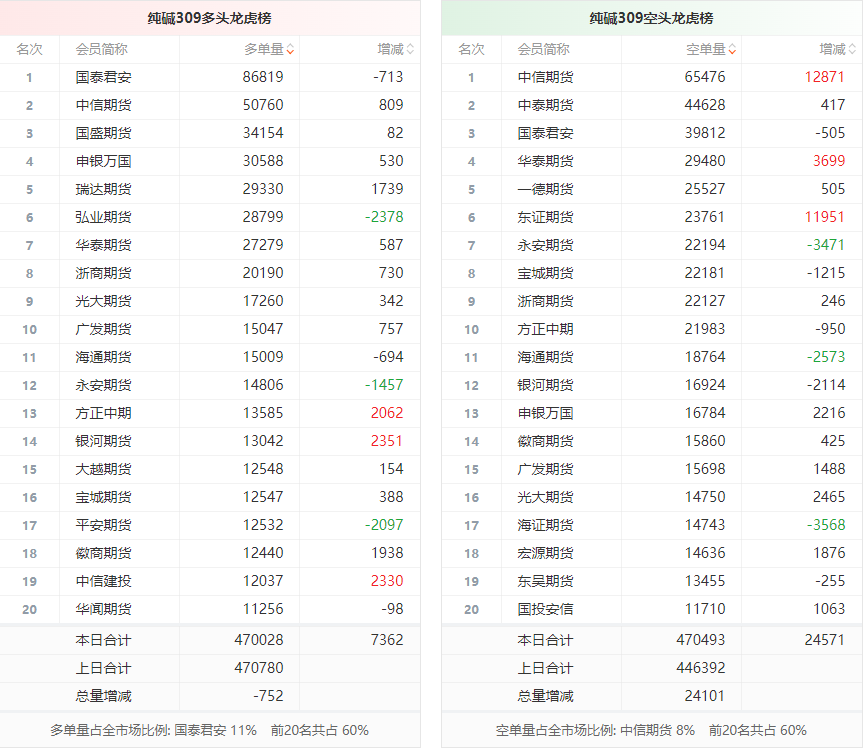 总体而言,纯碱309合约今日增仓下行,多空持仓排名前20席中,多方呈退场态势,空方呈进场态势。