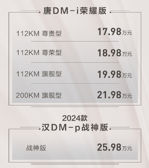 其中,比亚迪汉DM-i荣耀版售价16.98万元起,汉EV荣耀版17.98万元起售,唐DM-i荣耀版17.98万元起售,同时也有售价25.98万元的2024款汉DM-p战神版。并且汉EV荣耀版顶配车型会是王朝网首款搭载“天神之眼”智能驾驶系统的车型。