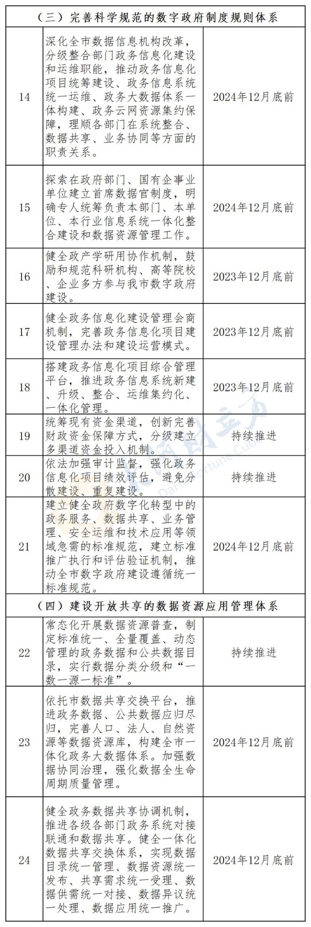 以数字化助推政府职能转变、治理方式变革和业务流程优化,深化全市数据信息机构改革,分级整合部门政务信息化建设和运维职能,推动政务信息化项目统筹建设、政务信息系统统一运维、政务大数据体系一体构建、政务云网资源集约保障,理顺各部门在系统整合、数据共享、业务协同等方面的职责关系。