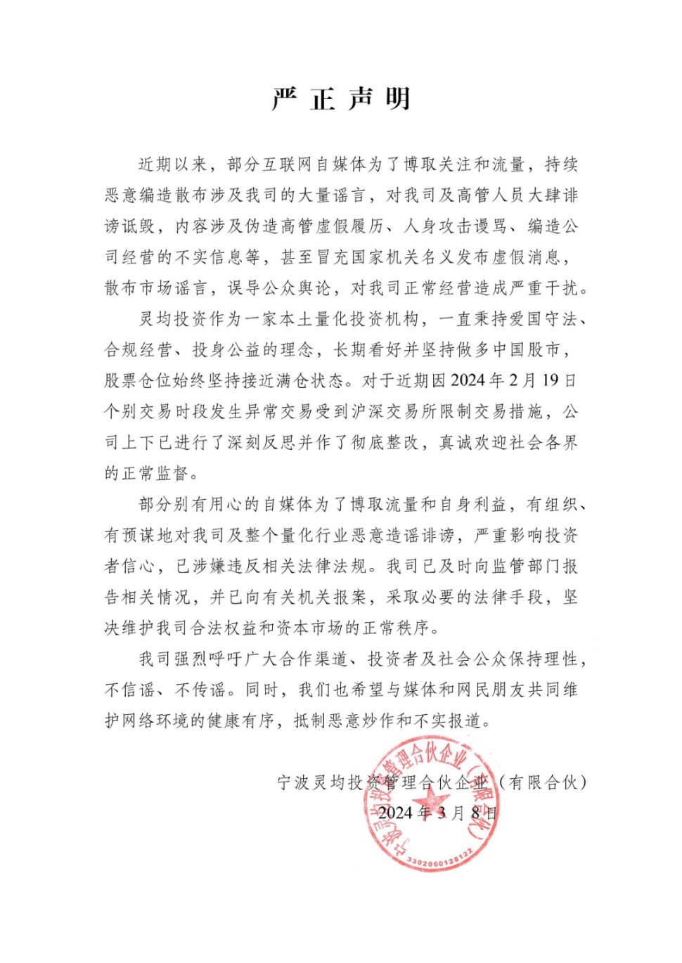 灵均投资表示,公司自上月以来,深刻反省整改,采取了合规前置、平滑交易、优化风控等一系列改进措施,并第一间向相关监管部门、合作渠道和投资者进行了如实汇报,得到了相关方的认可与支持。目前公司运作一切正常,公司将持续改进迭代,一如既往地看好并坚持做多中国股市,切实维护正常市场交易秩序,全力保障市场公平以及广大投资者合法权益。